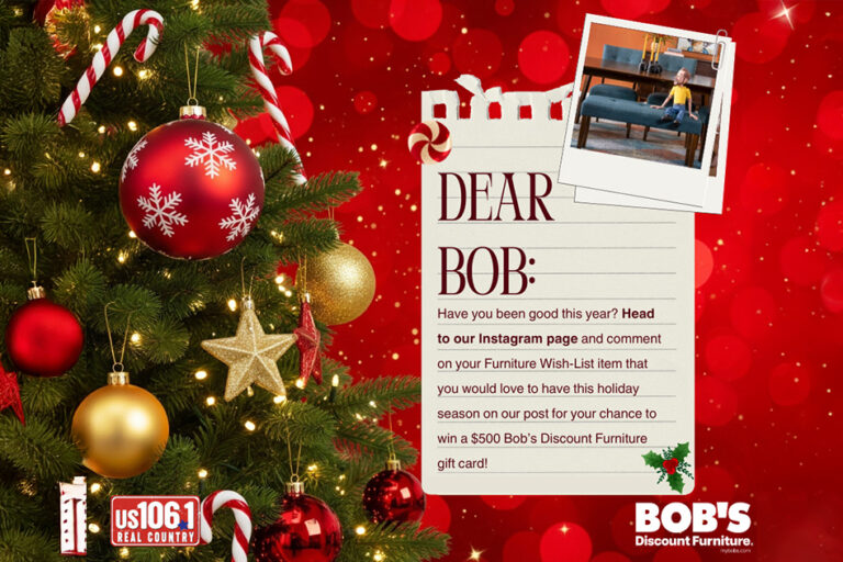 It’s Wish-List time!? Think of the furniture item you’re dreaming of this holiday season… now head to our Instagram page to tell us! Follow @us1061 and comment your wish-list item on the post for your chance to win a $500 Bob’s Discount Furniture gift card, courtesy of Bob’s Discount Furniture. Our contest rules, as well…