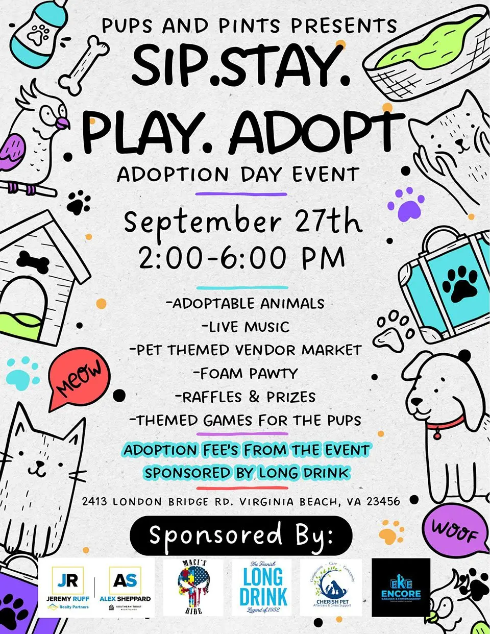 Come hang out with the 93.7 BOB FM Team at Pups and Pints in Virginia Beach for an event you won’t want to miss. Enjoy live music and games, plus a chance to win some great prizes. You’ll also get to meet adorable, adoptable pets who are looking for their forever homes. Even better, adoption fees for the day will be sponsored by Long Drink!